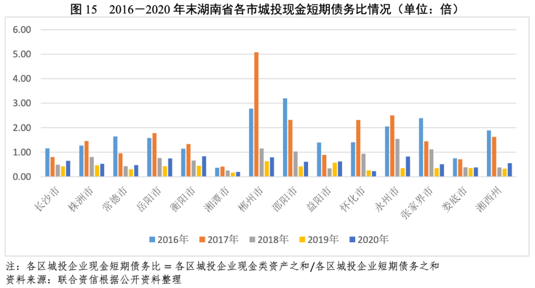 近年來,湘潭市發債城投企業債務收縮明顯,企業債務負擔有所減輕;婁底市發債城投企業債務擴張有所放緩,債務負擔基本保持穩定;其余大部分地級市發債城投企業呈現債務擴張趨勢,債務負擔有所加重,資金主要流入長沙市高信用級別城投企業。截至2020年底,衡陽市發債城投企業債務負擔有所加重,其余各地級市發債城投企業債務負擔均有所減輕,長沙市、株洲市、岳陽市、衡陽市、懷化市和張家界市發債城投企業債務負擔仍相對較重;大部分地級市發債城投企業流動性壓力均有所緩和,但湘潭市發債城投企業短期流動性壓力在省內各地級市中排名仍靠前。湖南省各市城投企業未來償債壓力主要集中在2022年至2024年,湘潭市、株洲市、長沙市和常德市發債城投企業2022年債券兌付壓力相對較大,各地級市發債城投企業債務償還仍主要依賴于外部籌資。