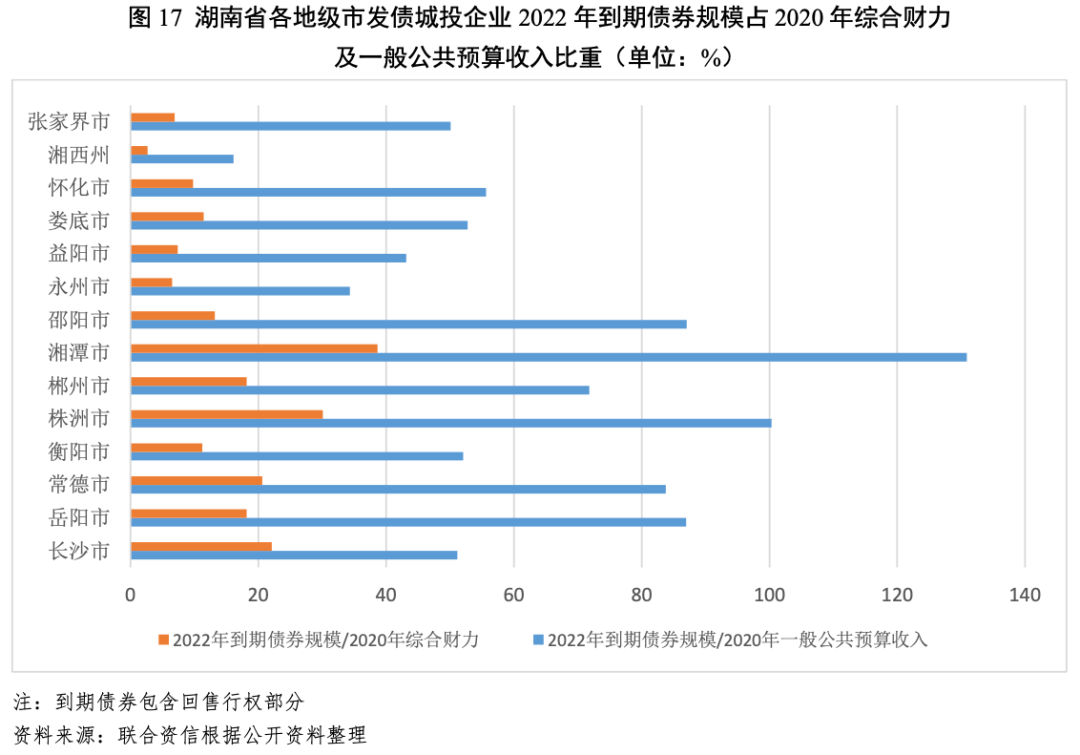 從一般公共預算收入以及綜合財力對2022年到期債券的覆蓋情況看,各地級市中2022年到期債券規模/2020年綜合財力比值較高的為湘潭市、株洲市、長沙市和常德市,分別為38.66%、30.11%、22.09%和20.62%。湘潭市、株洲市、長沙市和常德市2022年城投企業債券兌付壓力相對較大。