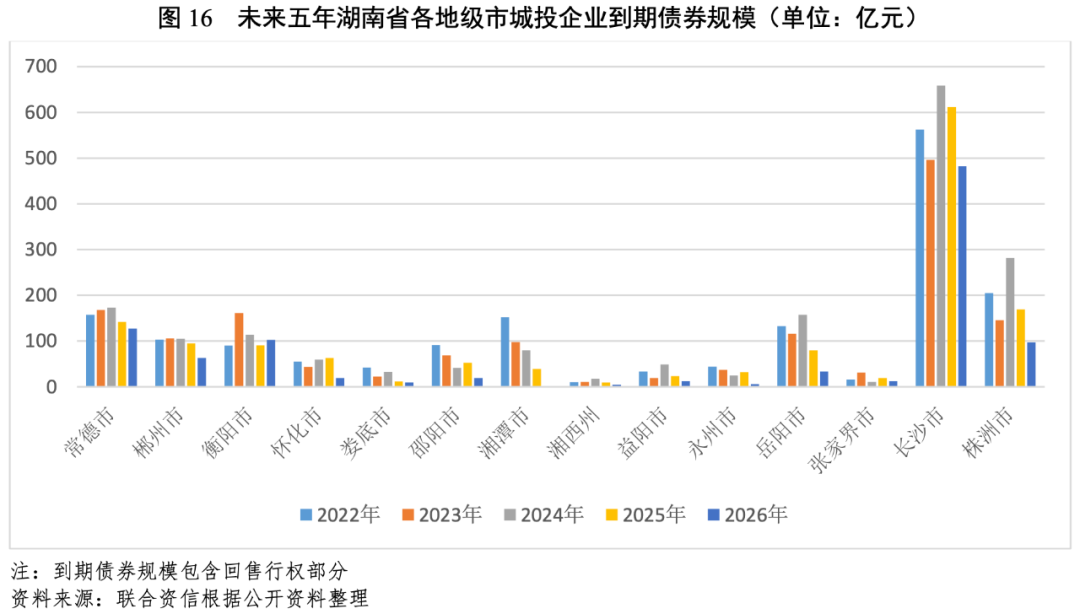 從湖南省各地級市發債城投企業未來五年(2022-2026年)到期債券規???,長沙市、株洲市和常德市的城投企業未來三年集中到期債券規模大,湘西州、益陽市、張家界市和婁底市城投企業到期債券規模相對較小,各地級市未來五年債券到期規模整體處于波動下降趨勢,債務償還日期主要集中在2022-2024年。
