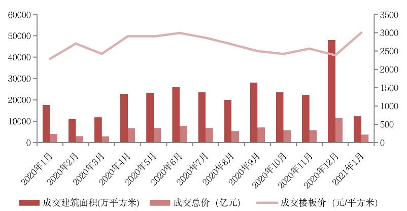 圖:銷售50強房企2020年1月至2021年1月單月拿地金額走勢(單位:億元)