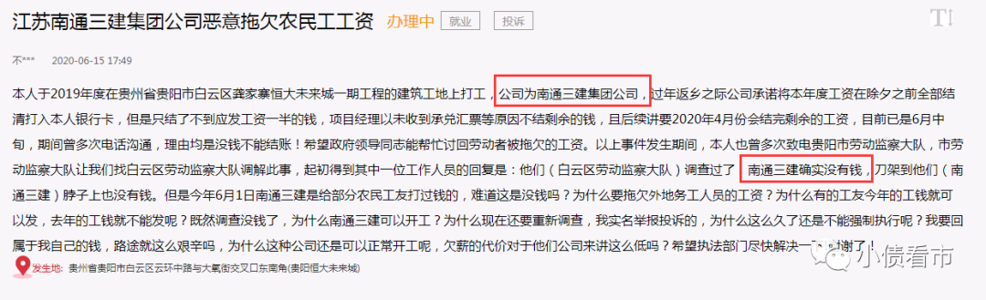 2020年6月,有網友在人民網《領導留言板》向貴陽市委書記反映,南通三建拖欠農民工工資。后經白云區(qū)人社局協(xié)調,南通三建才將所拖欠9名員工工資全部發(fā)放,共計15.64萬元。