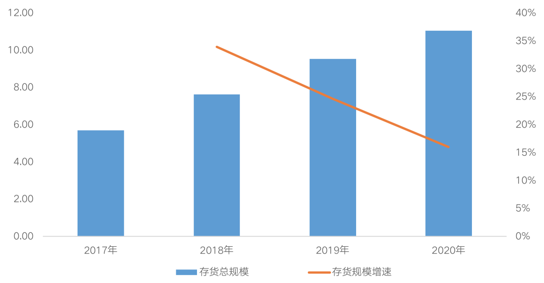 從企業角度而言,截至2020年底,存貨規模達到萬億的房企有三家,分別是恒大1.4萬億元、碧桂園1.1萬億元和萬科1萬億元,其中碧桂園和萬科是首次進入萬億行列。