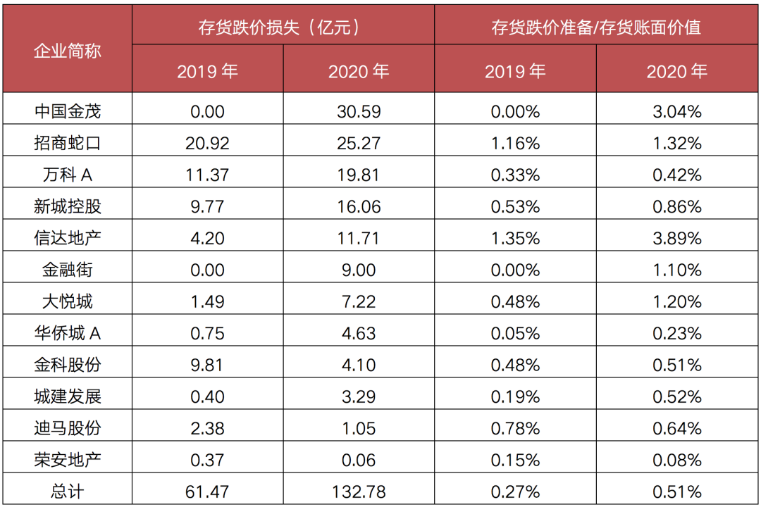 據CRIC監測,2020年12家企業計提的存貨跌價損失同比增長超過一倍,中國金茂、金融街在年內計提了比較大額的存貨減值,拖累了企業盈利;而招商蛇口則連續兩年計提超過20億元的存貨減值,萬科、新城、信達等2020年計提存貨減值金額都有明顯上升。