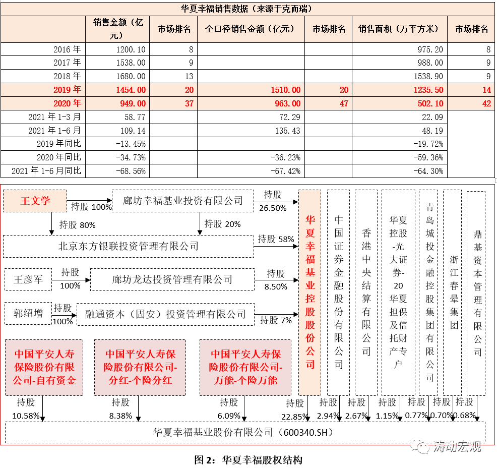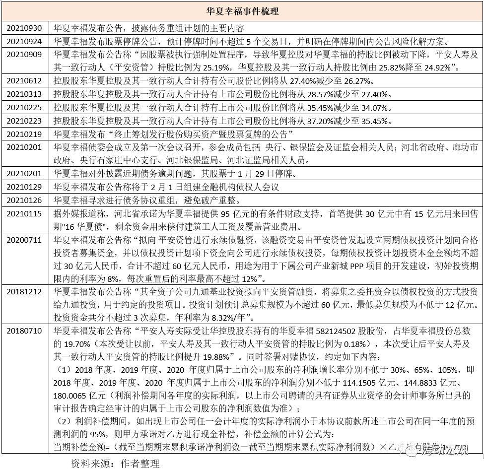 (一)雖然表面上看華夏幸福流動性危機始于2021年1月,但實際上早在2018年華夏幸福的困局便開始出現,期間平安人壽及其一致行動人的加持一定程度上延緩了華夏幸福危機的爆發,給華夏幸福帶來了一些希望。不過在2020年疫情及限購等政策影響下,華夏幸福面臨的困局進一步加劇,并爆發出目前市場所熟知的流動性危機。