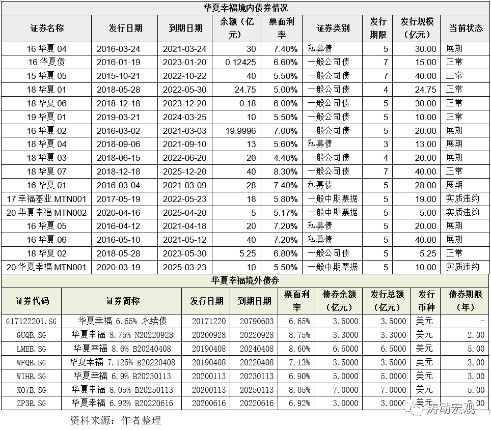 2、華夏幸福目前境外共有7只債券,共計31.80億美元,平均融資成本為7.57%。其中,有3只美元債券于2022年到期(合計9.80億美元)。有4只美元債在2020年發行,主要是因為華夏幸福2020年以來在境內發債的難度較大。