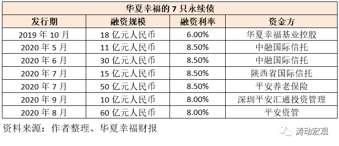 華夏幸福共有7只人民幣永續債,資金方共涉及平安、中融信托、陜西省國際信托以及其控股股東等主體。其中,6只永續債集中于2020年發行,中融信托向華夏幸福提供41億元人民幣融資(成本為8.50%)、平安系提供120億元人民幣融資(成本為8-8.50%)、陜西省國際信托提供15億元人民幣融資(成本為8.50%)以及華夏幸福基業控股提供18億元人民幣融資(成本為6%)。