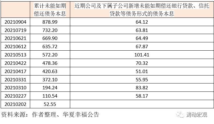 2、截至2021年9月4日,華夏幸福累計未能如期償還的債務本息為878.99億元,較今年2月的52.55億元已累計增加826.44億元。