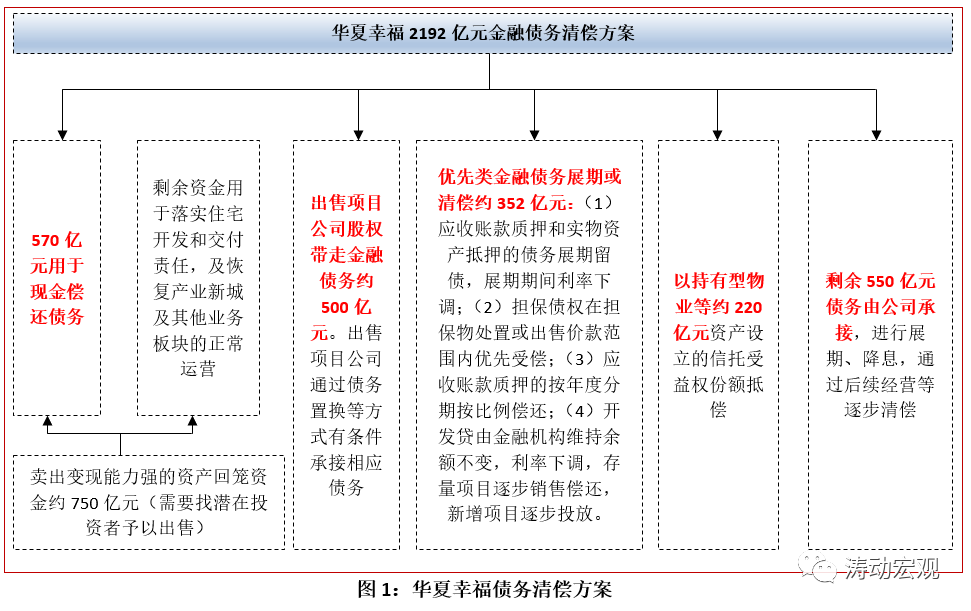 華夏幸福約2192億元的金融債務清償方案基本上堅持“出售資產現金清償、債務跟隨項目走以及對部分債務進行展期、下調利率、豁免罰息”的原則。