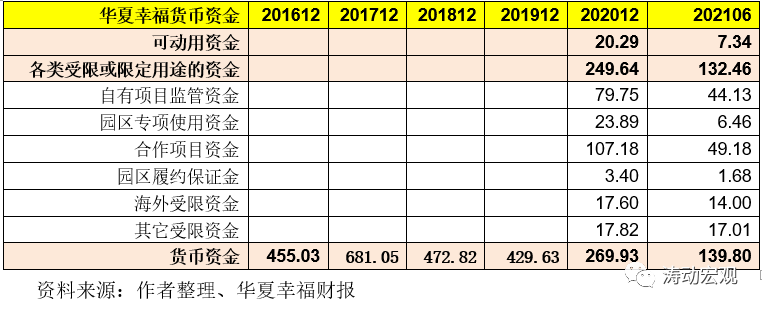 2018年以來,華夏幸福的貨幣資金呈逐年加快下滑的態勢,2017年貨幣資金余額為681.05億元,2018-2020年分別降至472.82億元、429.63億元和269.93億元,今年上半年進一步降至139.80億元。不過華夏幸福的貨幣資金中,大多受限,如截至今年上半年,華夏幸福可動用的貨幣資金實際上只有7.34億元。