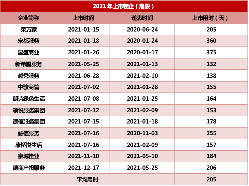 從審批節奏來看,物企獲批進度放緩,同比延后約68天。根據克而瑞物管和中物研協統計,2020年17家在港交所上市的物企從初次交表到成功上市平均歷時137天,而2021年上市的13家物企平均用時205天。