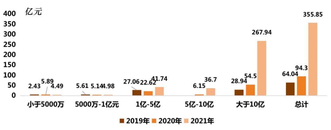 截至2021年12月31日,1-5億,5-10億元,以及10億元以上的并購事項(19項、5項和7項)均較上年同期增多(10項、1項和3項);并購金額分別為41.75億元、36.70億元和267.94億元,分別較上年同期增長84.54%、497.11%和391.68%,并購事項及并購總額均顯著增加。