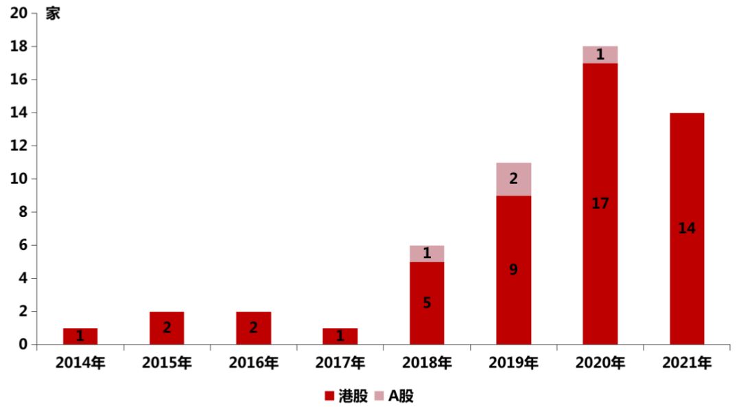 從遞表企業來看,2021年行業遞表物企數達34家,為迄今為止遞表企業最多的一年,但從實際推進進程來看,年內遞表并成功上市的僅有9家。此外,年內新增上市物企共14家(其中13家為常規IPO上市,均為港股物企),較上年18家減少4家,未及預期。