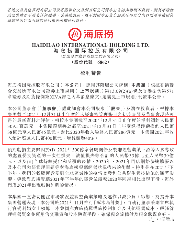 2月21日,海底撈盈利預(yù)警顯示,預(yù)計(jì)2021年將錄得38億-45億元的凈虧損,其中大部分與300多家餐廳關(guān)閉和停業(yè)造成的一次性虧損有關(guān),一次性損失約33億-39億元。