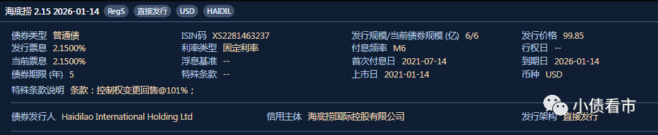 《小債看市》統(tǒng)計(jì),目前海底撈僅存續(xù)上述一只美元債,存續(xù)規(guī)模6億美元,票息2.15%,將于2026年1月14日到期。