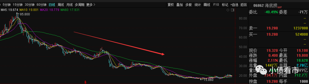 隨著口碑下降,海底撈的股價(jià)也開(kāi)始跌跌不休,由2021年初的85.8港元高位一路下跌至19港元附近,市值縮水近八成,蒸發(fā)約3700億港元。