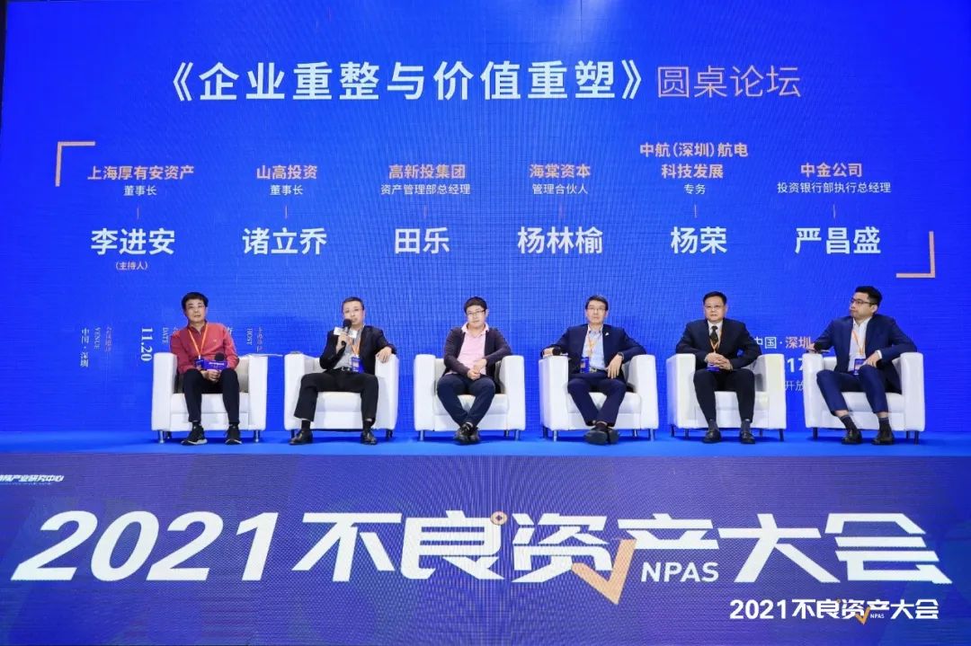 大會第一場圓桌:《企業重整與價值重塑》由上海厚有安資產董事長李進安主持,與山高投資董事長諸立喬 、高新投集團資產管理部總經理田樂、海棠資本管理合伙人楊林榆、深航電專務楊榮、中金公司投資銀行部執行總經理嚴昌盛一起對話。