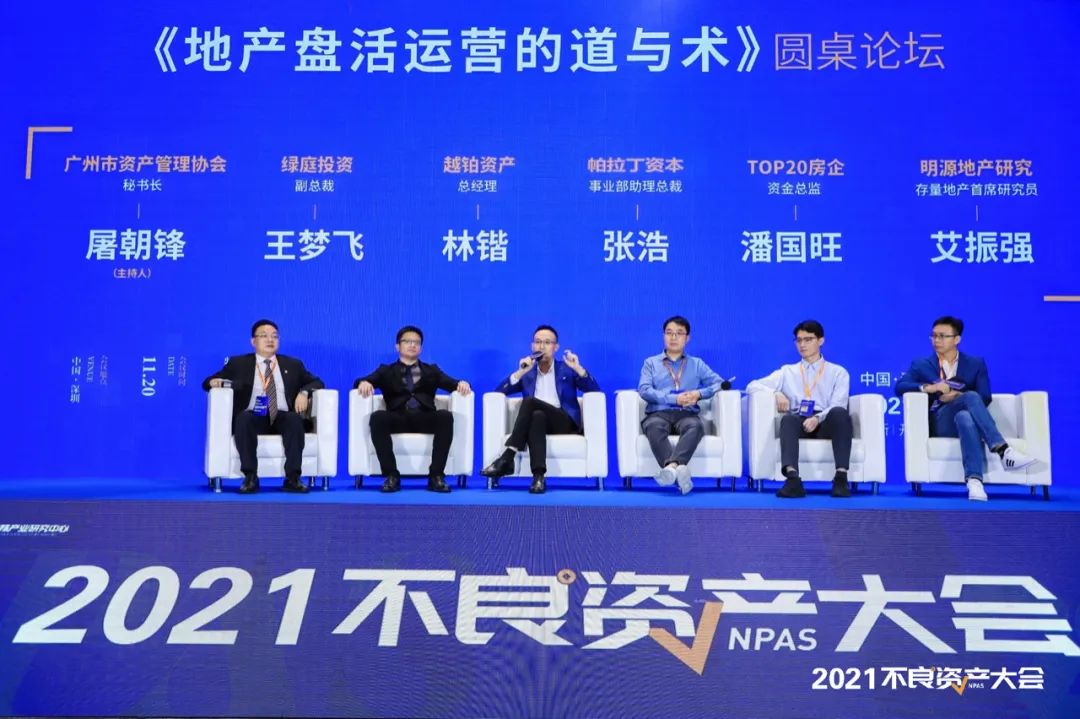 大會第二場圓桌《地產盤活運營的道與術》由廣州市資產管理協會秘書長屠朝鋒主持,與綠庭投資副總裁王夢飛、越鉑資產總經理林鍇、帕拉丁資本事業部助理總裁張浩、TOP20房企資金總監潘國旺、明源地產研究 存量地產首席研究員艾振強一起對話。
