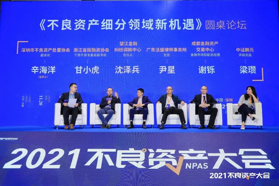 大會最后一場圓桌《不良資產細分領域新機遇》,由深圳不良資產處置協會副會長辛海洋主持,與浙江省投融資協會個貸不良專委會秘書長甘小虎、望江金融糾紛調解中心合伙人沈澤兵、廣東法盛律師事務所主任尹星、成都金融資產交易中心金融市場部副總經理謝鑠、中證鵬元評級總監梁瓚一起對話。