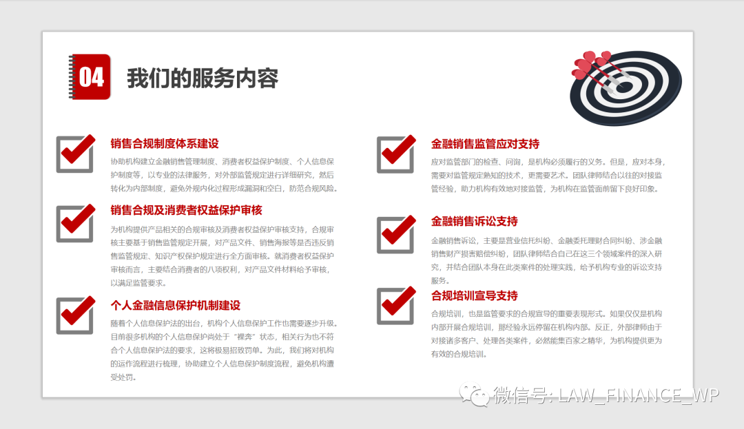 原標題: 法律服務產品:金融產品銷售合規管理法律服務