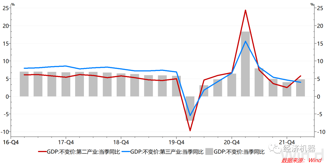 分行業看,第二產業增速顯著提升,是GDP提速的主要拉動項。一季度第二產業GDP同比增速為5.8%較上季度提升3.3個百分點;第三產業GDP同比增速為4.0%,較上季度下滑0.6個百分點。第三產業的下滑可能主要到受疫情影響。春節過后,我國多地疫情爆發。特別是上海、深圳等大型樞紐城市,鐵路運輸、航空運輸、住宿、餐飲等接觸性聚集性行業受到較大的沖擊。