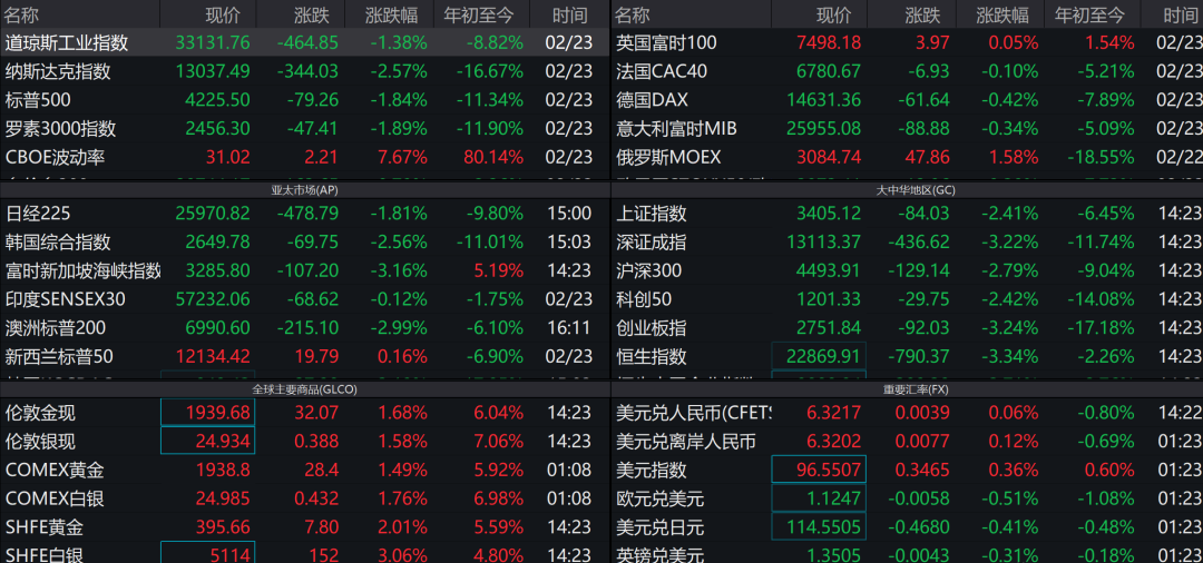 截至目前,美國三大股指均大幅下挫,道瓊斯工業指數下挫1.38%、納斯達克指數下挫2.57%、標普500指數下挫1.84%;日經指數下挫2.07%,恒生指數下挫3.25%;中國股指受沖擊亦比較大,上證綜指下挫1.44%、深證成指下挫2.11%、滬深300下挫1.93%、創業板指數下挫2.18%。避險資產受追捧,市場對大宗商品價格上行預期亦比較充分,黃金價格大幅抬升,倫敦金現大幅抬升1.77%至1942美元/盎司,美元指數升至96.64,原油價格突破100。