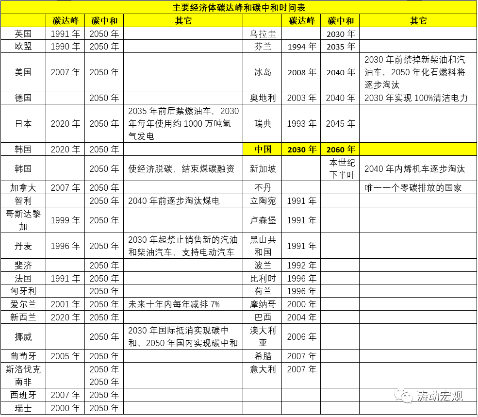 2、雖然中國設(shè)定的碳達(dá)峰和碳中和時(shí)間進(jìn)度落后于其它主要經(jīng)濟(jì)體(大部分經(jīng)濟(jì)體在2050年及之前實(shí)現(xiàn)碳中和目標(biāo)),但是我國碳達(dá)峰和碳中和之間僅相隔30年,較其它經(jīng)濟(jì)體普遍在40年以上來說,我國緩和的時(shí)間比較窄。