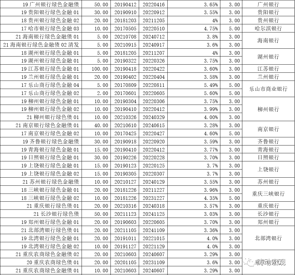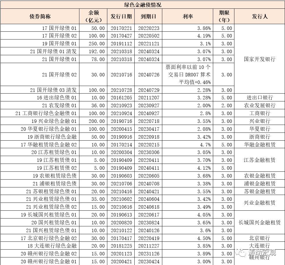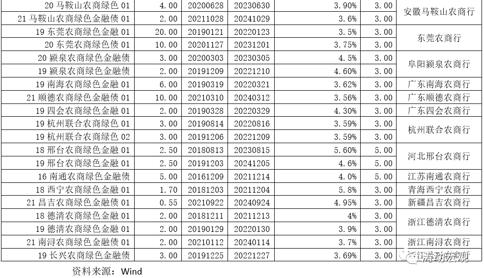 (2)目前股份行中有3家銀行有存續(xù)綠色金融債(分別為興業(yè)銀行、華夏銀行和浙商銀行);城商行中有24家銀行有存續(xù)、農(nóng)商行中有15家銀行有存續(xù);全國性銀行僅1家有存續(xù)(工行);非銀金融機(jī)構(gòu)有7家有存續(xù),且均為金融租賃公司,分別為江蘇金融租賃、華融金融租賃、農(nóng)銀金融租賃、浦銀金融租賃、蘇銀金融租賃、興業(yè)金融租賃和長城國興金融租賃。