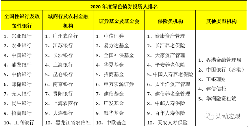 2021年1月12日,交易商協(xié)會在其官方微信號上公示了2020年度綠色債券投資人排名(根據(jù)投資人參與綠色債務(wù)融資工具的投資程度)。可以看出,全國性銀行中興業(yè)銀行、農(nóng)業(yè)銀行、中國銀行、浦發(fā)銀行和中信銀行排名前五,城商行及農(nóng)村金融機(jī)構(gòu)中廣州農(nóng)商行、江蘇銀行、長沙銀行、上海銀行和昆侖銀行位居前五,其它如理財(cái)公司等亦有參與。