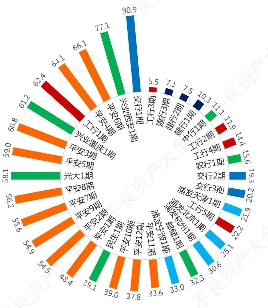 從已公告的34期銀行個(gè)貸不良資產(chǎn)來看,建行的三期平均逾期月數(shù)(按未償本息加權(quán)平均,下同)只有七個(gè)半月,即便在傳統(tǒng)清收領(lǐng)域,也不算長賬齡資產(chǎn)。而平均逾期月數(shù)最長的為平安銀行,接近五年。此外,工商銀行為41.6個(gè)月,交通銀行為31.9個(gè)月,浦發(fā)銀行為27.1個(gè)月,其余銀行則為1至5年不等。其中單期平均逾期月數(shù)最長的為交行1期的90.9個(gè)月,賬齡超過七年半;最短的為工行3期不足半年。就銀行個(gè)貸不良來看,賬齡分布比較全面,客觀上基本照顧到了不同賬齡專長的資產(chǎn)管理公司或處置機(jī)構(gòu)。