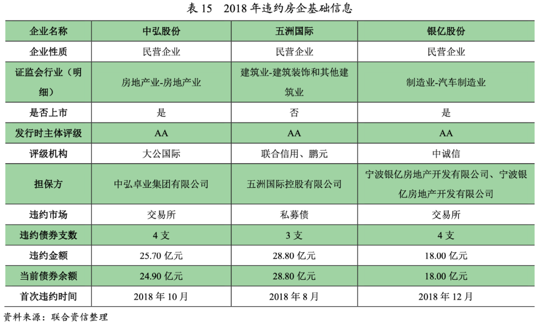 2018年違約房企以民營中小型企業為主,區域分布一般、資產快速變現能力相對較差,且多在業務擴張或內部管理或業務模式選擇上存在一定問題,在行業調控持續收緊并逐步向三四線蔓延的背景下中小型房企內生現金流吃緊;疊加房地產行業集中度不斷提升,分化速度不斷加快的因素,中小型房企競爭優勢減弱、再融資能力下降,外部現金流受限,流動性壓力顯著加劇。在內外部共同因素的共同影響下,中小型房企成為行業寒潮來臨中的首批違約房企。