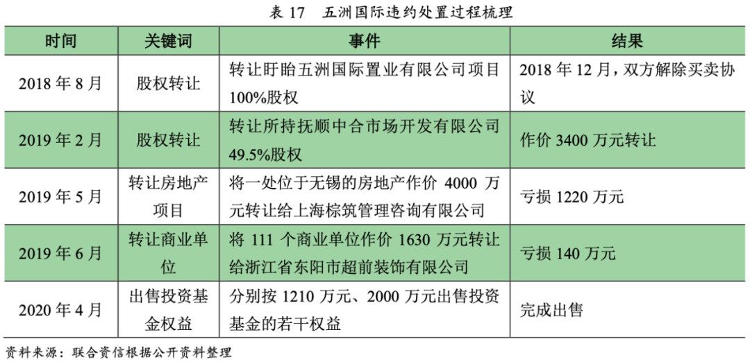 總結:五洲國際由盛轉衰原因分析:其一,公司項目多布局于江陰、襄陽、大理等三四線城市,近年來這些地區房地產市場疲軟,住宅和商業項目運轉較為困難;其二,近幾年電商崛起及人們消費習慣的改變,對主打商業地產的五洲國際造成較大沖擊。違約后,五洲國際多通過變賣資產的方式獲得現金流,但因其信譽受損較大且資產質量欠佳,變現難度大;大量逾期債務最終能否順利償還仍存在較大不確定性。