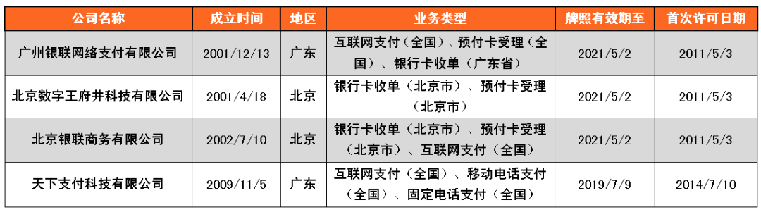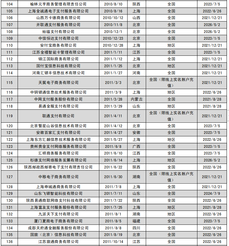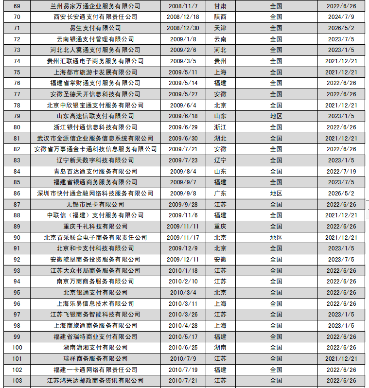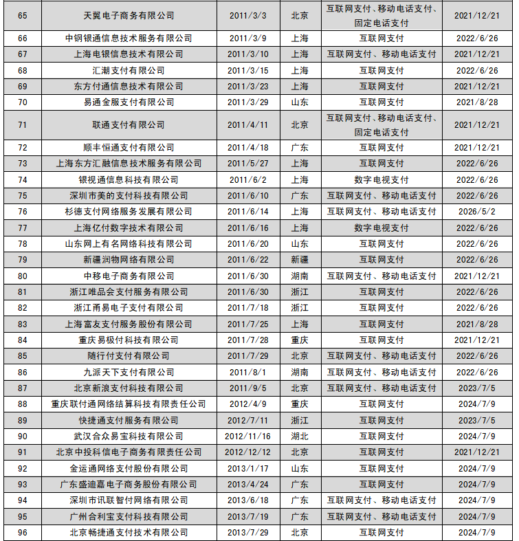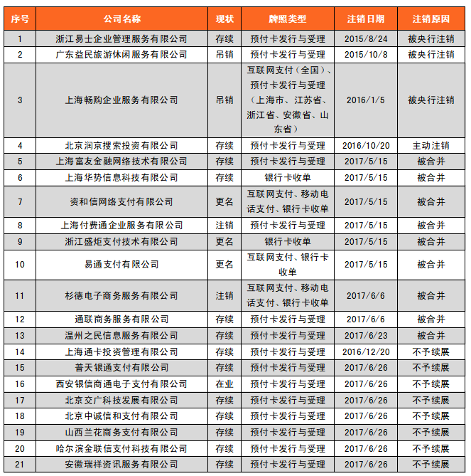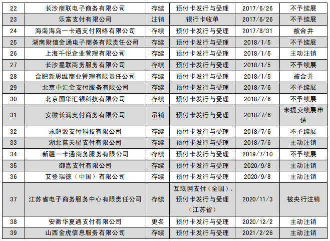 2021年5月13日,央行官網(wǎng)公布首批27張支付牌照續(xù)展結(jié)果,支付寶、財(cái)付通、銀聯(lián)商務(wù)、資和信、銀盛支付、通聯(lián)支付等24家支付機(jī)構(gòu)全部通過續(xù)展。廣州銀聯(lián)網(wǎng)絡(luò)支付有限公司、北京數(shù)字王府井科技有限公司、北京銀聯(lián)商務(wù)有限公司擬與其控股股東銀聯(lián)商務(wù)股份有限公司開展整合工作,向人民銀行提交了中止續(xù)展審查申請(qǐng),在中止審查期間繼續(xù)開展業(yè)務(wù)。