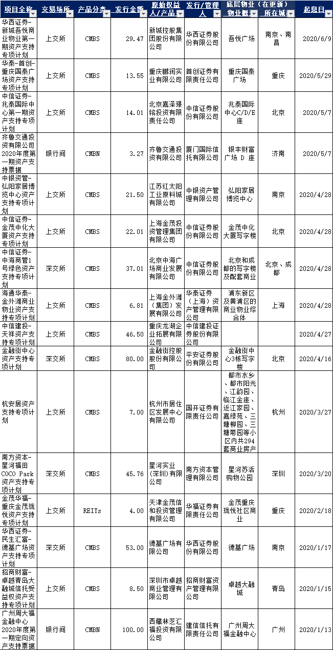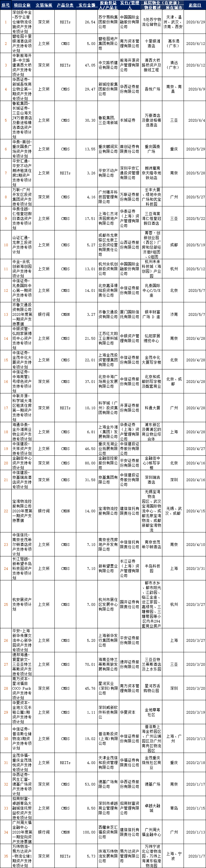 2020年1月1日至2020年6月30日,國內已發行CMBS/類REITs產品35單,總規模815.44億元,其中類REITs產品6只、CMBS產品29只。