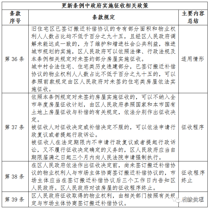更新條例中,與政府實施征收相關的條款主要都在第三章“拆除重建類城市更新”中,主要條款在于第36條、第37條、第38條、第39條這四條,主要政策概覽如下表: