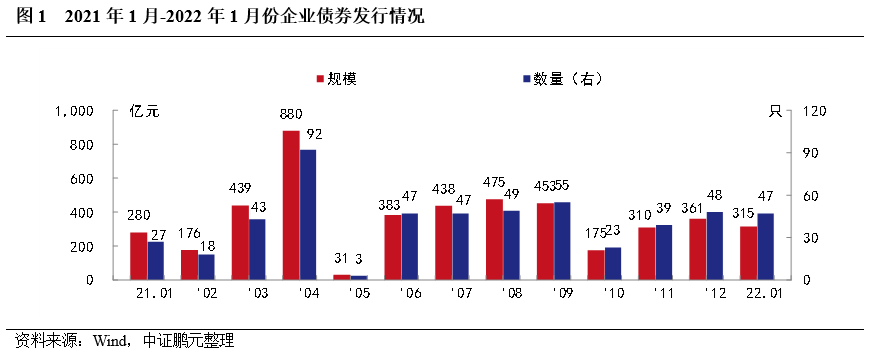 2022年1月企業債券發行47只,發行規模315.30億元,較上月分別下降2%和13%,較上年同期分別增長74%和13%,發行規模近月維持相對穩定。