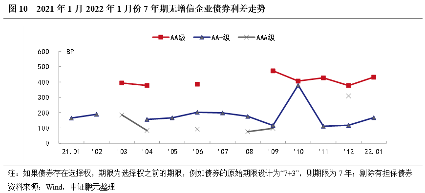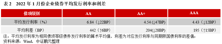 2022年1月,企業債券最高發行利率為8.00%,較上月上行50BP;最低發行利率為2.94%,較上月下行24BP。從債券級別來看,與上月相比,本月各級別企業債平均發行利均下行,其中AA+級下行47BP,幅度最大;平均發行利差方面,AA+級企業債平均發行利差收窄28BP,AA級和AAA級分別擴大6BP和15BP。
