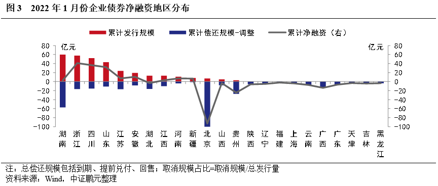 從地區分布看,2022年1月份多省企業債凈融資以凈償還為主。具體看,浙江、四川和山東分別實現凈發行41、36和32億元、遠高于其他省份。北京因償還規模較大,當月凈融資規模-93億元。此外,陜西、遼寧等10個省份本月未發行企業債,以償還為主。