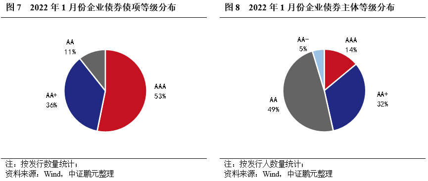 2022年1月發行的企業債債項信用等級以AA+級為主,AA+及以上的高級別品種數量占比93%,較上月下降0.3個百分點。