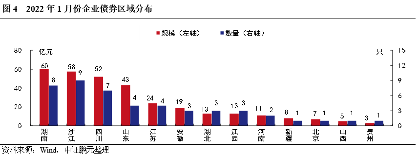 2022年1月,共有13個省份發行了企業債券。其中,湖南和浙江分別發行59.90和57.50億元,規模高于其他省份,其次,四川和山東分別發行51.90和43億元。與上年同期相比,本月除湖北和山東發行規模出現下滑,其余省份均出現增長,其中,四川同比增長419%,漲幅最大,其次是湖南,增長344%。此外,山西發行5億元企業債券,為2021年來首次發行,發行主體為“山西建設投資集團有限公司”,主體評級AAA。