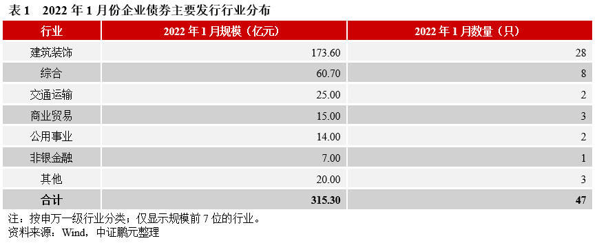 2022年1月,企業債券發行人主要分布在建筑裝飾、綜合等行業。其中,建筑裝飾的發行規模占比為55%,為近一年較高水平,其次,綜合行業發行規模占比19%,交通運輸行業發行規模占比7.9%。