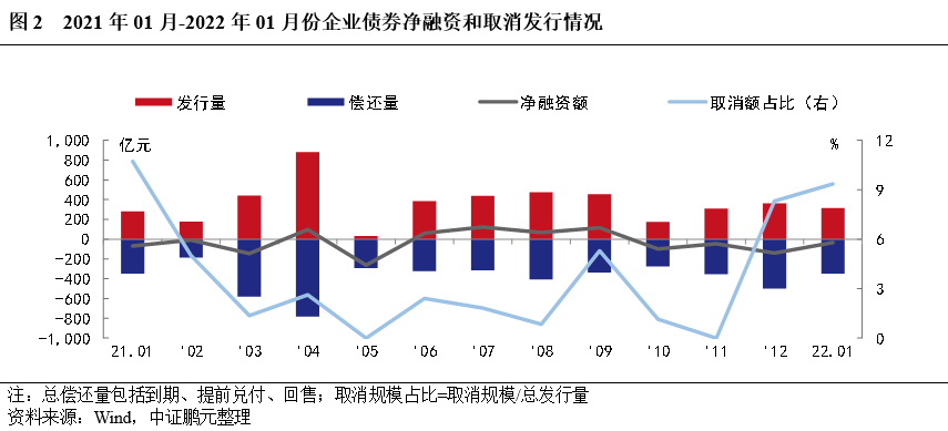 從凈融資情況來看,1月企業債券總發行規模315.30億元,總償還規模349.68億元,本月表現為凈償還34.38億元,上年同期為凈償還69.01億元。此外,2022年1月有2只企業債券取消發行,原計劃發行規模29.50億元,取消發行規模占比9.4%,為近一年峰值。2月,企業債待償還規模116.61億元,為近一年低位。本月回售壓力不大,僅2只含權債券,債券余額26.40億元。