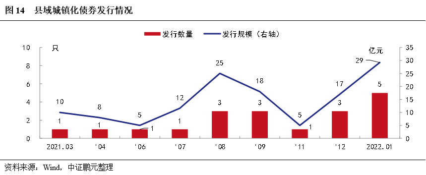 2022年1月,縣城新型城鎮化企業債(簡稱“縣域城鎮化債券”)發行5只,規模合計29.20億元,為首次發行以來的單月峰值。自2021年1月以來,本創新品種共發行19只,規模合計128.80億元,涉及15家發行主體。