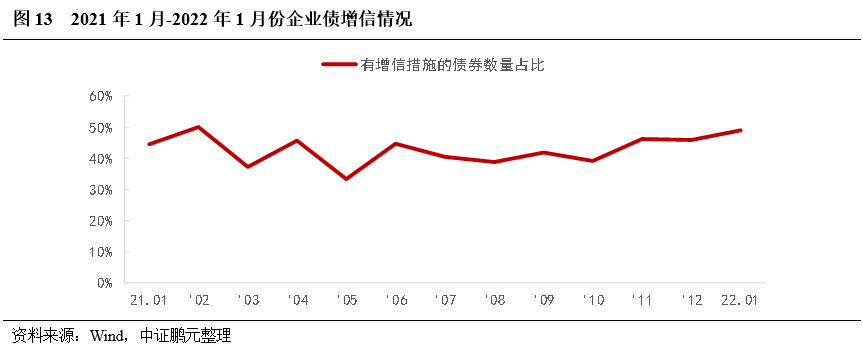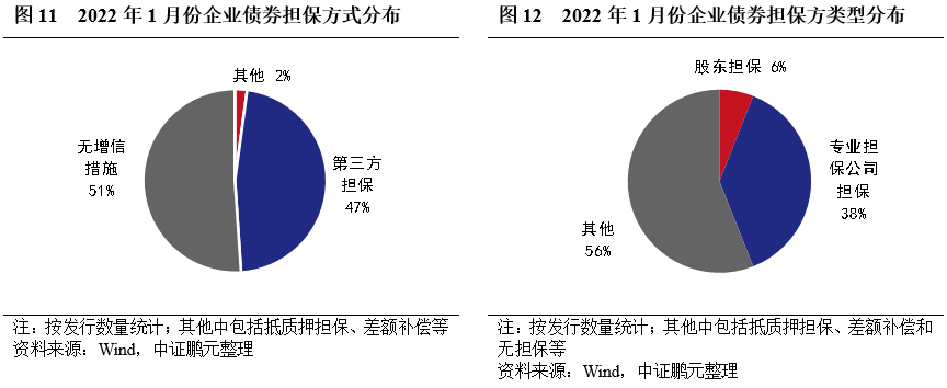 2022年1月,企業債有擔保的債券共計23只,數量占比49%,較上月上升3個百分點,主要是AA+級主體增信比例上升。分主體級別看,AA級主體選擇增信發行的債券比重為77%,較上月下降3個百分點;AA+級主體選擇增信發行的債券比重為25%,上月均未增信。從擔保方類型看,專業擔保公司依然為主體擔保主體,占比38%。