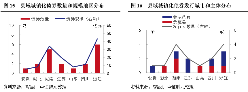 分城市看,目前有7個省份的12個城市發行過縣域城鎮化債券,其中,浙江和湖南為主要發行地區,分別發行6只和5只,規模分別為43.10億元和34億元。分城市看,共有13個區縣參與發行,示范縣6個,占比46%。除浙江桐廬縣和瀏陽市分別有2家發行人外,其余地區均有一家。