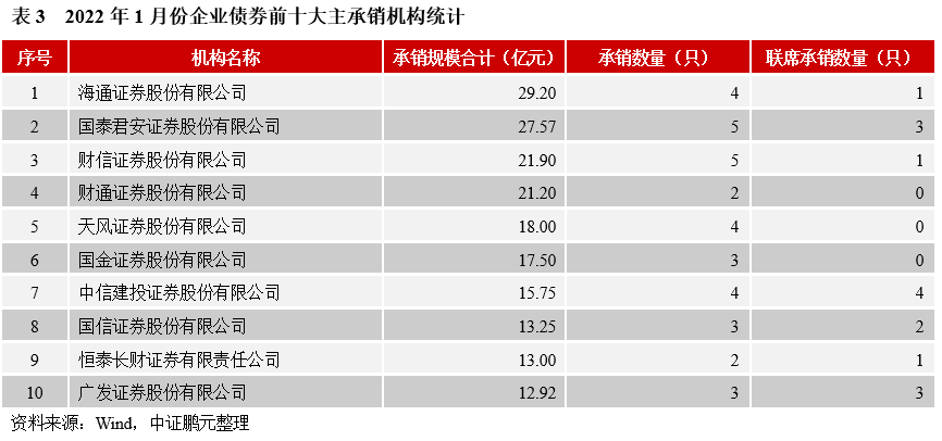 就承銷機構而言,2022年1月共有28家機構參與企業債券的承銷工作。海通證券承銷29.20億元,位居第一;國泰君安證券承銷27.57億元,位居第二;財信證券承銷21.90億元,位居第三。