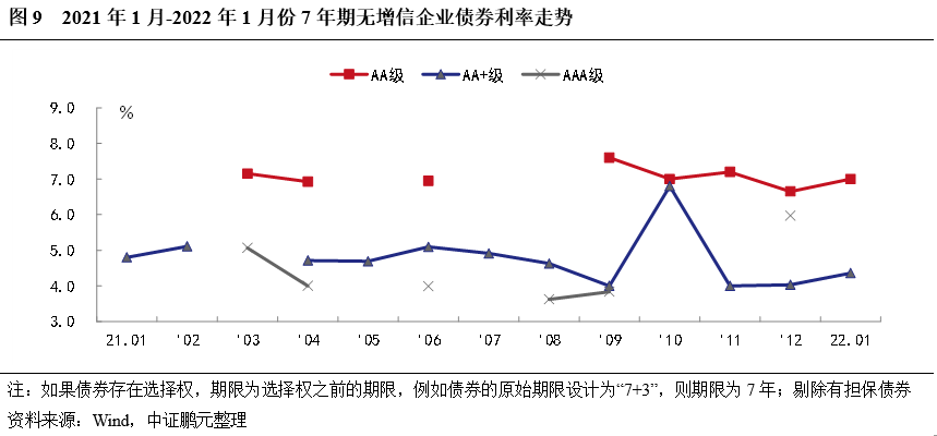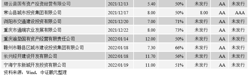 2022年1月,企業債券期限分布于7年期等期限品種。其中,7年期品種發行36只,占比77%,發行規模203.30億元,占比65%;5年期品種發行5只,占比11%,發行規模34億元,占比11%。與上月相比,5年期和7年期品種發行規模占比較上月分別下降8.7和上升9個百分點。
