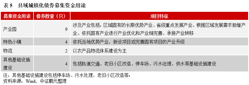 從募集資金用途看,目前主要集中在產業園建設和特色小鎮兩個領域,其他方面包括物流、停車場、污水處理、老舊小區改造等城市基礎設施建設。第一,產業園發展因地而異。發展較早的地區進入園區整合優化階段,包括園區整合、數字化改造以及產業鏈升級、完善等。例如,“22新城債”,募集資金用于浙江省大力推動的新材料產業,以及當地長期優勢產業醫療器械領域,以及依托安防小鎮和醫療器械產業園而起步的電子器械產業園。部分地區為推動經濟社會發展,新設產業園,以實現資源聚集。例如,2020年陽新縣納入縣城新型城鎮化建設示范名單,為滿足建設要求,解決產業基礎薄弱、吸納就業能力不足等問題,發行專項債券用于城北農產品加工產業園項目。此外,寧鄉經濟技術開發區,為承接粵港澳大灣區美妝產業轉移,在區內打造美妝谷項目。第二,特色小鎮建設依托當地優勢產業,新設項目或完善固有項目的產業升級。例如,醴陵市經開區五彩陶產業小鎮,是湖南省首批省級特色產業小鎮示范項目之一,2021年發行專項債券用于小鎮產業鏈升級,包括建設智能標準生產設施、技術研發轉化設施、倉儲集散回收設施和文化旅游體育設施。第三,響應三農政策,推動農產品物流體系建設,促進農業產業化發展。例如,金堂縣打造冷鏈物流園項目、郎溪縣新設和改造提升原有農貿市場及配套基礎設施。