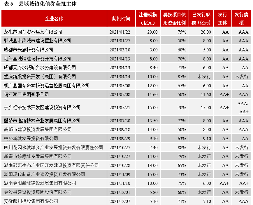 整體看,縣域城鎮化債券,發行主體不局限于示范縣,募投項目以重點產業為主。隨著“共同富裕”戰略的推進,發展重心從脫貧攻堅向鄉村振興,產業振興成為主要方式。2021年來,發改委已批準有29家企業注冊縣域城鎮化債券,注冊規模超過310億元。其中,2021年12月來注冊加速,分別有6家和4家主體。2022年,本創新品種發行或加速。