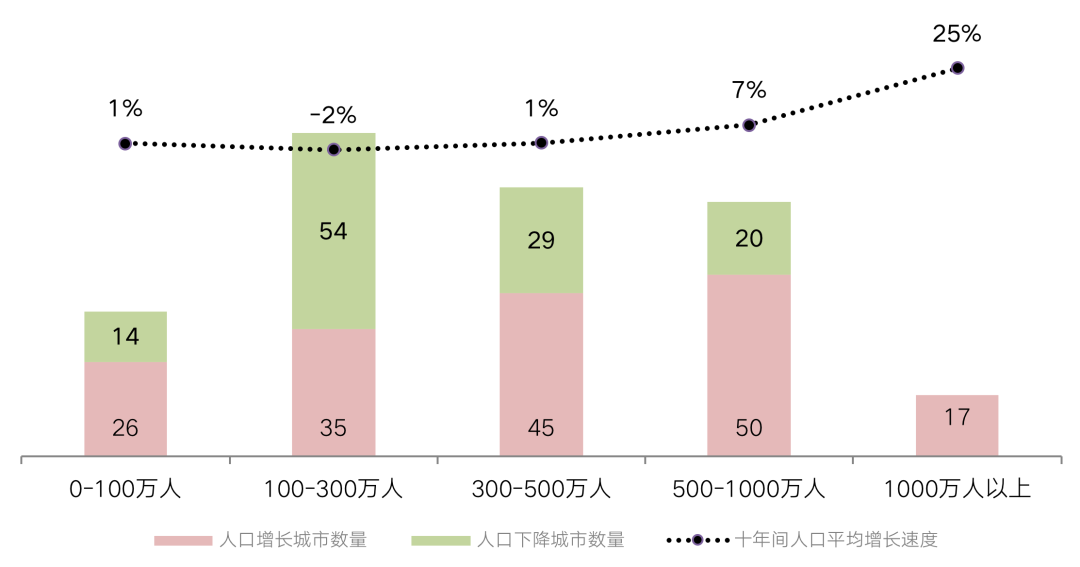 十年間,常住人口在繼續向大城市集聚已經成為人口流動的重要特點。近十年增加的人口都在向500萬、尤其是1000萬以上人口城市集聚。而100-300萬城市人口十年間下降的城市數量占比超過六成,成為了大中城市流動人口持續增長的重要“糧倉”。