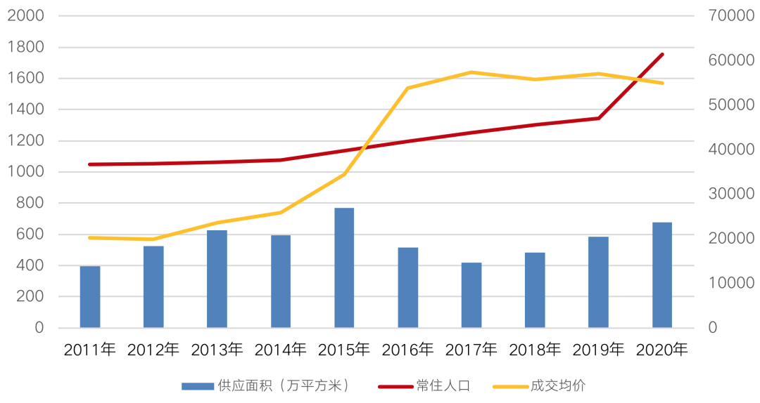 較低的落戶門檻一定程度上會刺激深圳樓市走向高房價、高成本。表現在房地產市場,受人口需求端刺激,深圳新建商品住宅成交均價從2011年至2020年,增長至54949元/平方米,十年間增長168%。